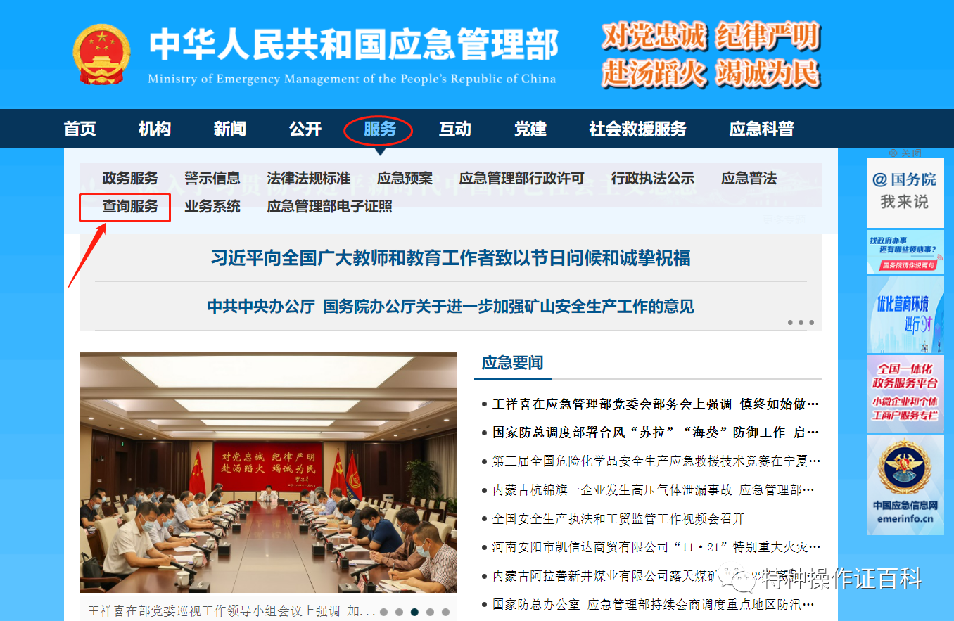 國(guó)家應(yīng)急管理局電子證書下載流程①進(jìn)入網(wǎng)站(https://www.mem.gov.cn/),滑動(dòng)至網(wǎng)頁中部查詢板塊,點(diǎn)擊“查詢服務(wù)”。②點(diǎn)擊“特種作業(yè)操作證及安...